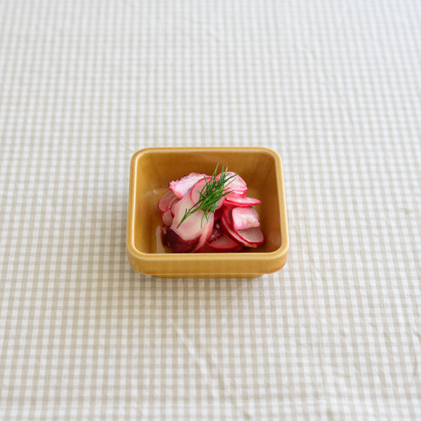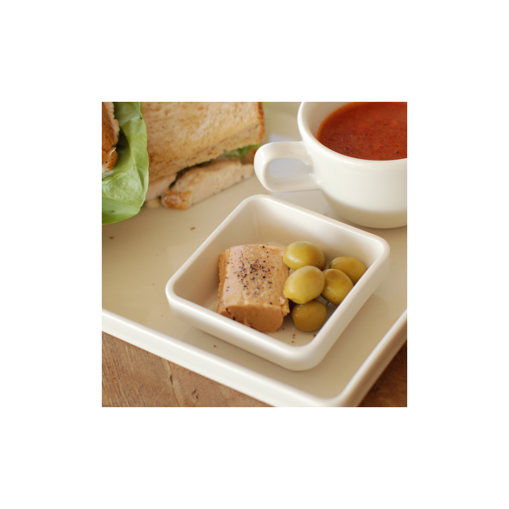 「プラッカ」はイタリア語で「プレート」を意味します。プラッカシリーズはオーブン使用が可能で大小様々なサイズで展開をしています。重なりもよく収納がしやすいのもポイントです。90スクエアは、浅小鉢として使ったり、ミニグラタンや焼きショコラなどの型としても。
