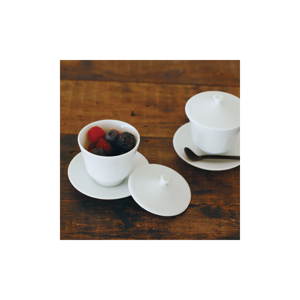 アペルトはイタリア語で「開ける」という意味。シンボリックなフォルムと無数に施された筋が美しいシリーズです。青みがかった白磁が清々しく、小さめの台が全体的に緊張感を与えているので、フォーマルな雰囲気にも適します。