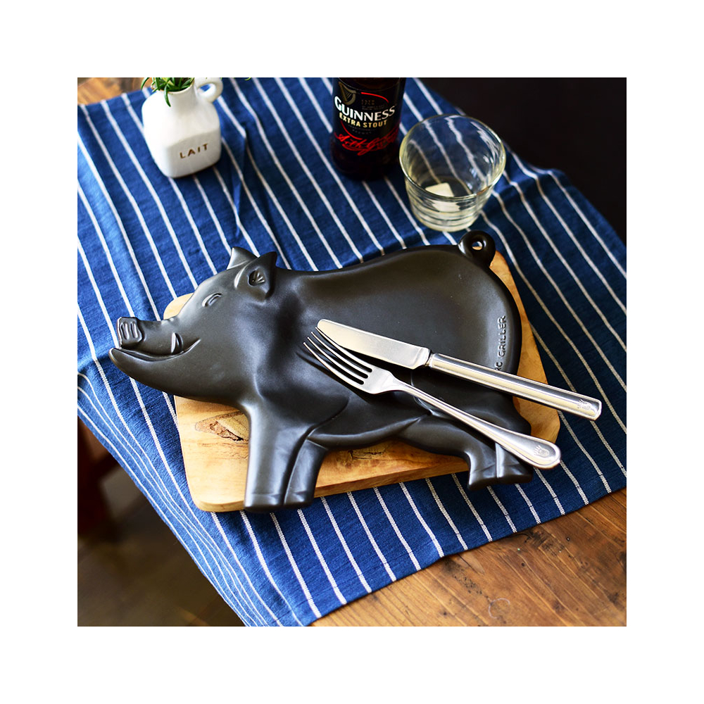 豚の形をした陶板とカトラリーのセット。