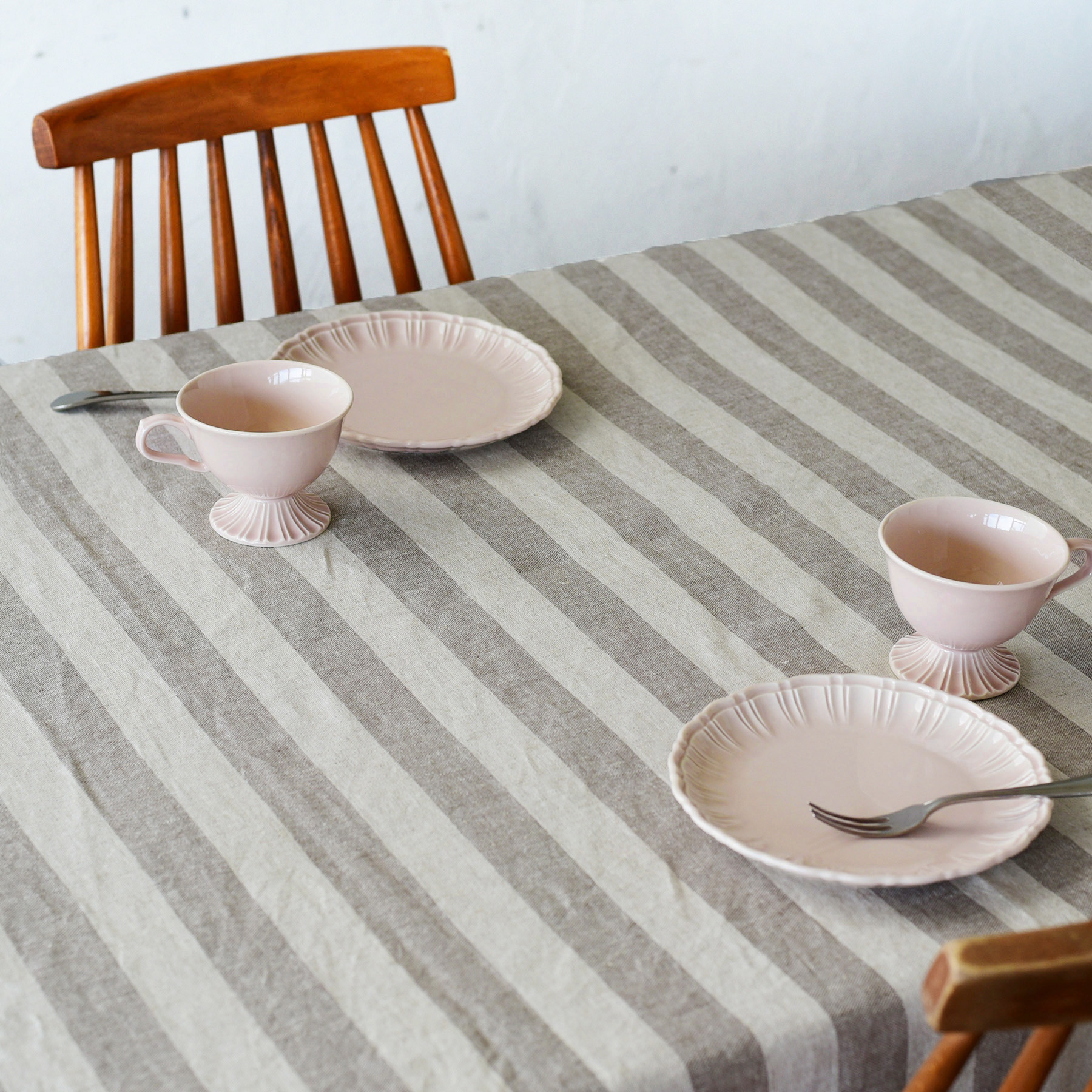 麻の生地色を生かし、落ち着きのある茶色を組み合わせたストライプ柄。リネン50%×ラミー50%の糸を使用し、ふっくらとした凹凸のある触り心地で使い込むほどにリネン特有の柔らかさも出てきます。やや厚手の生地は丈夫で汚れても気兼ねなく洗濯できます。