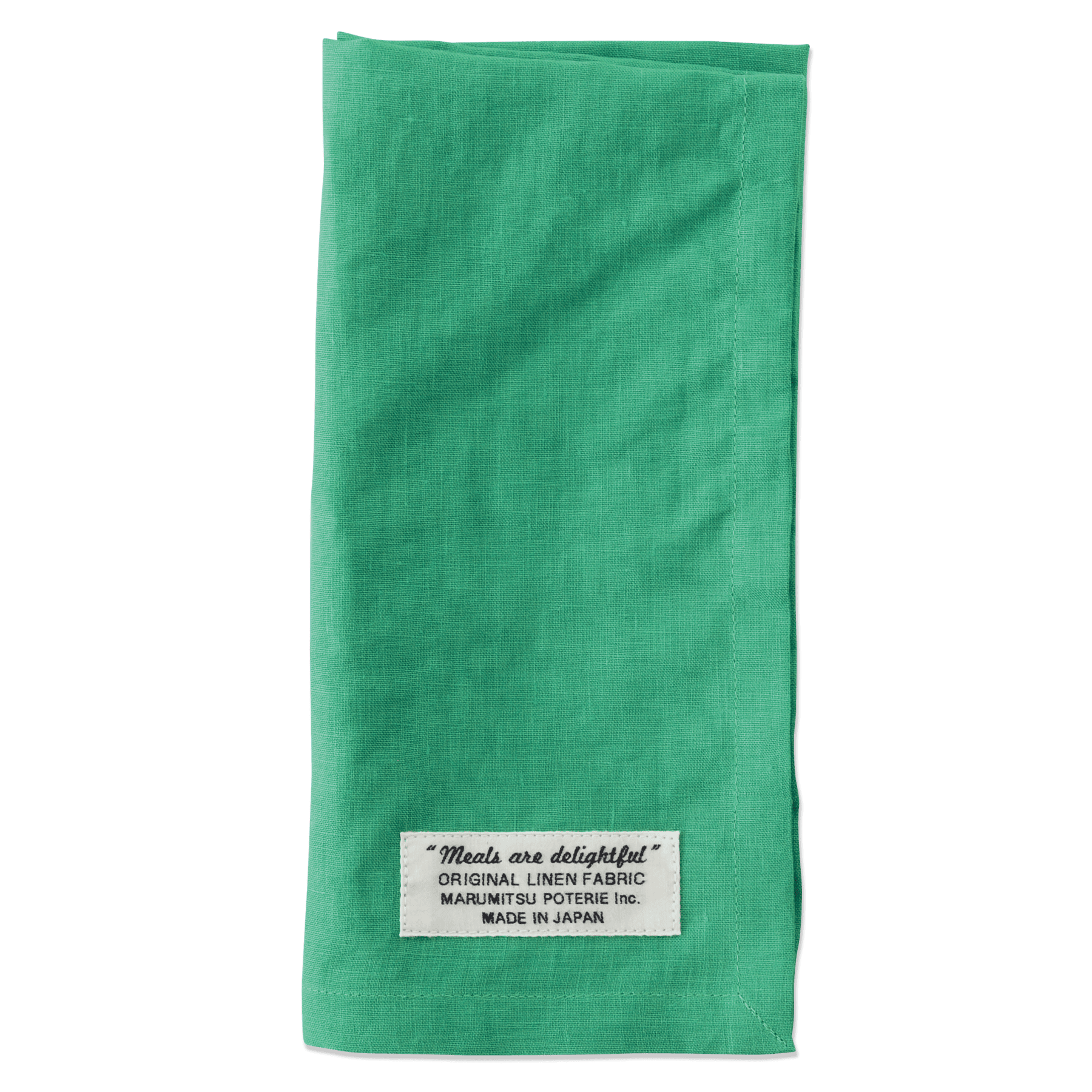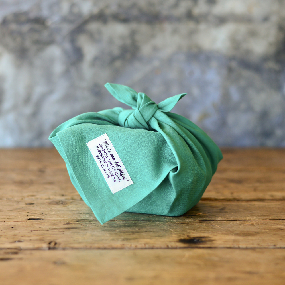 クロス500×500は正方形にすることでお弁当などの包み易さを重視。生地が薄手なので包んだり、生地端を合わせて結んだりしやすいです。生地端には長角のタグをつけワンポイントにしています。
