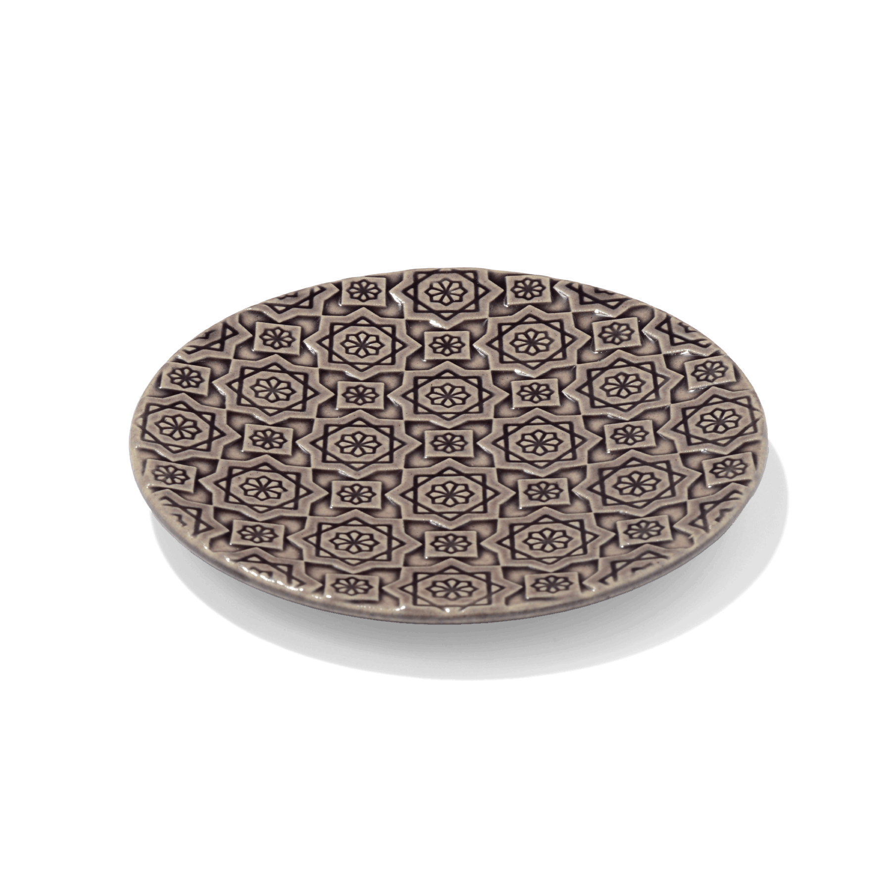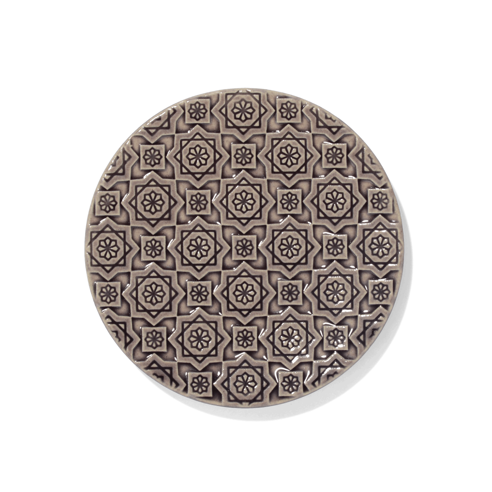 いつまでも飽きずに組み合わせて使えるように、 パターンは大紋と小紋の2種類。万華鏡を覗いた時のわくわく感や、花や星を思わせるデザインに仕上がっています。連続柄が浮かび上がる部分と釉薬がたまる部分の比率が美しくなるように線の太さや深さ、柄の大きさを考えています。