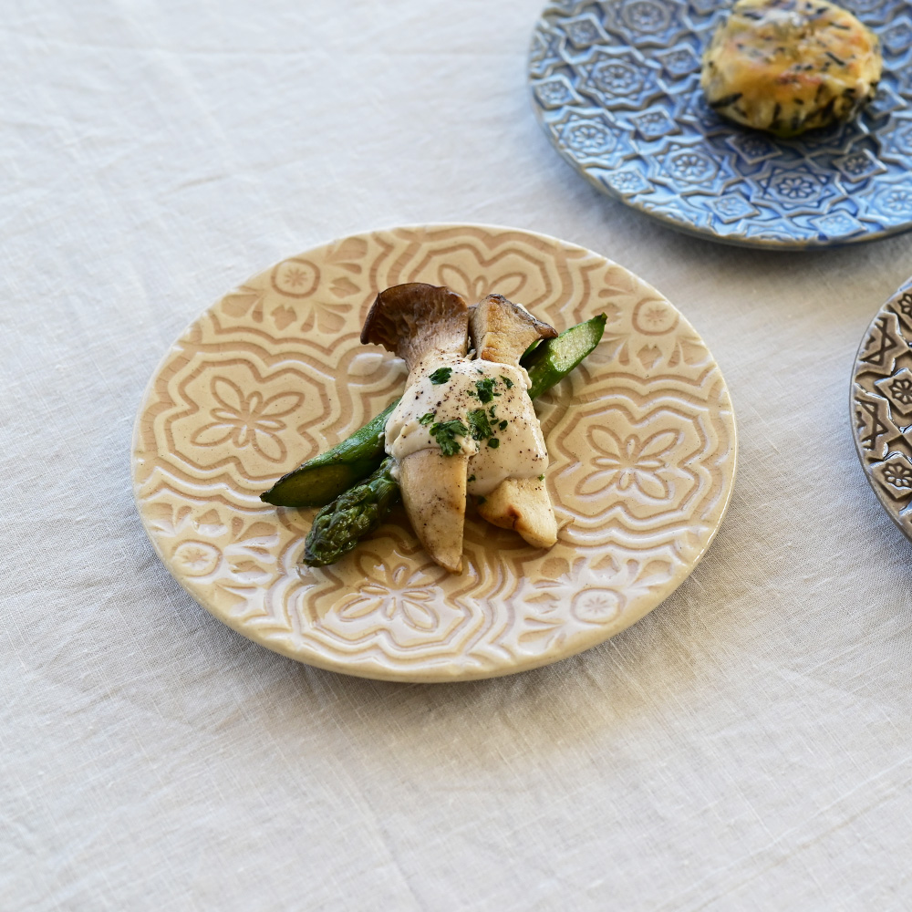 サイズは直径15cmほどで、銘々で使える大きさ。菓子皿や受け皿として、生春巻きやサラダの取皿として食卓でもコンパクトに収まります。