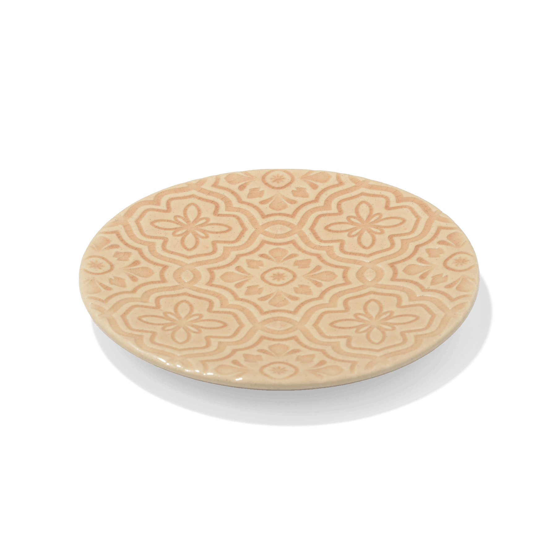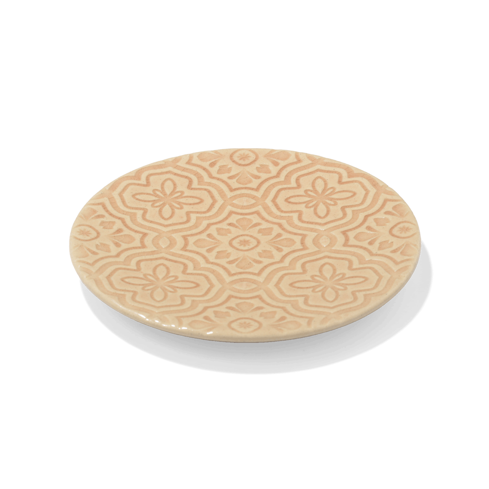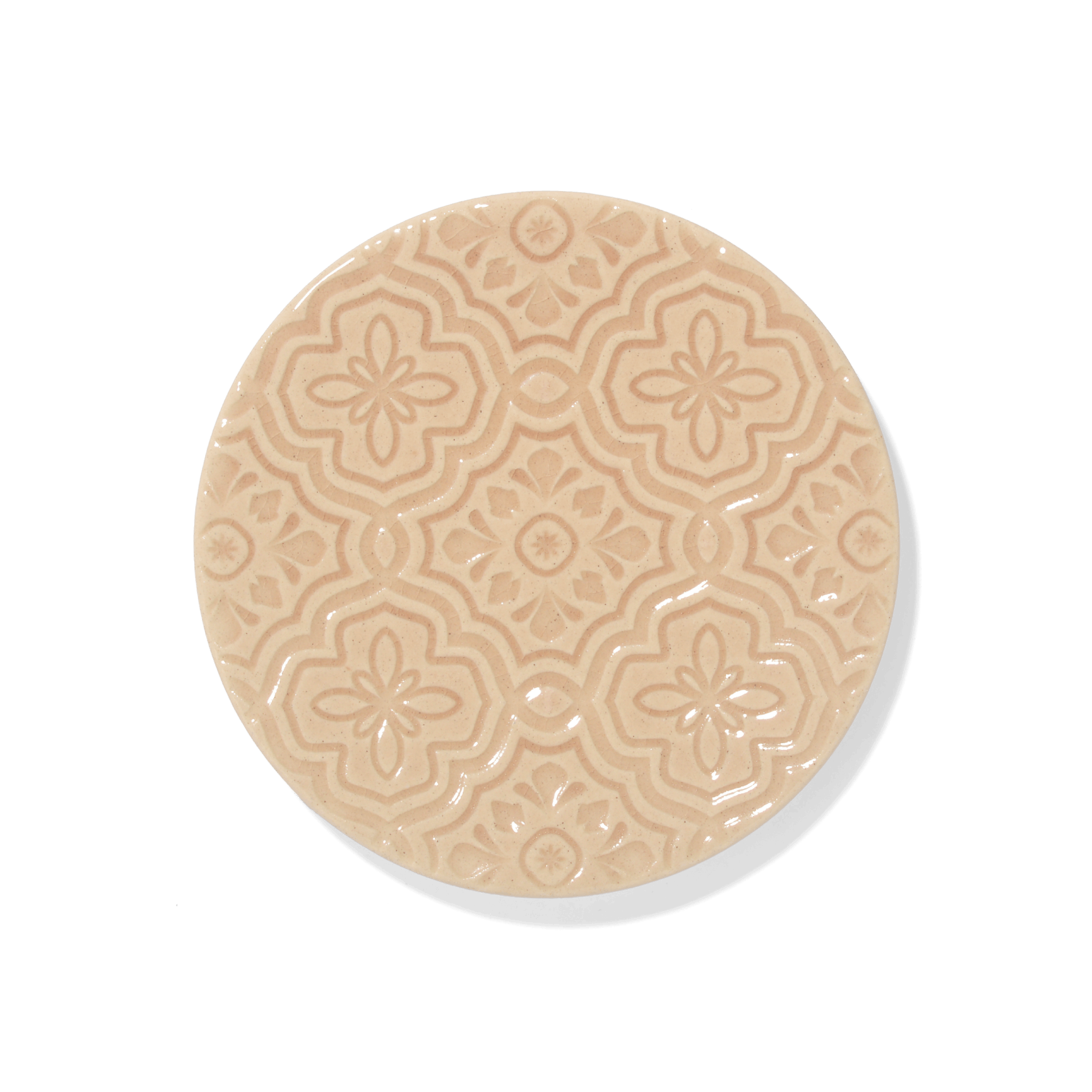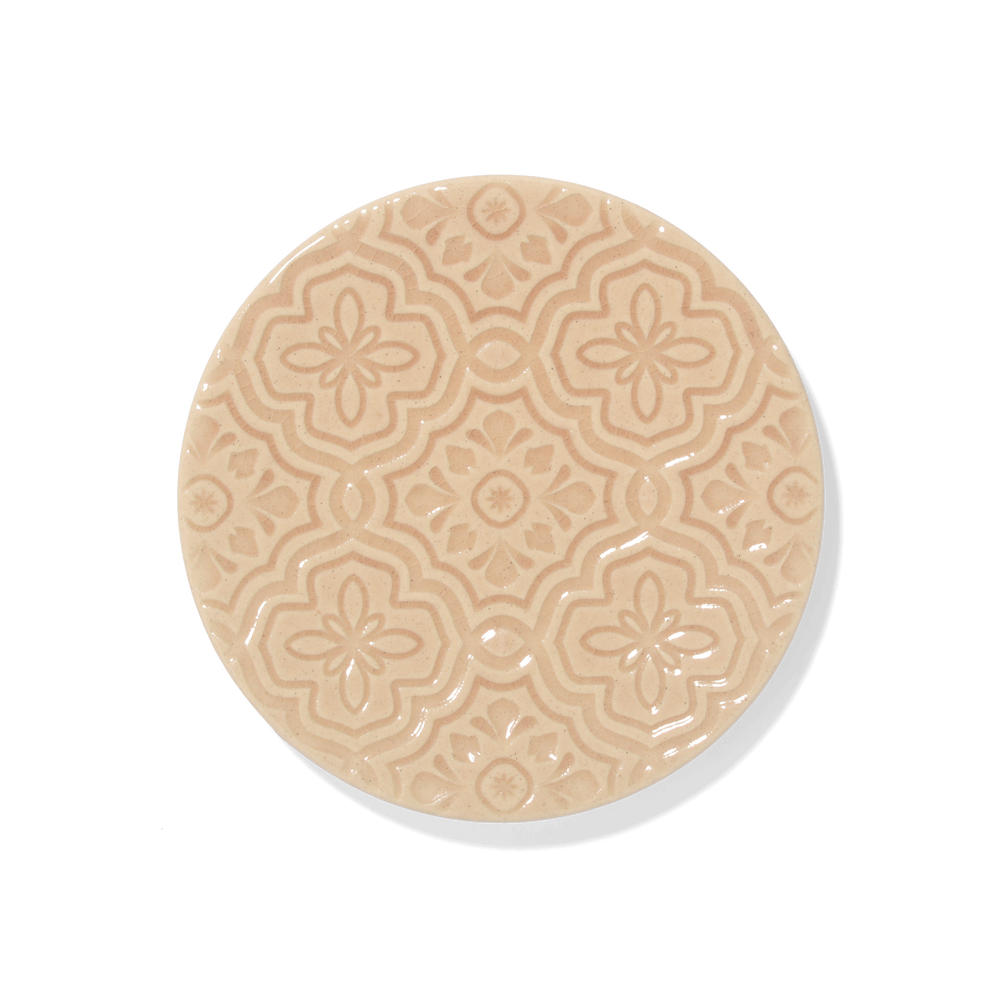 いつまでも飽きずに組み合わせて使えるように、 パターンは大紋と小紋の2種類。万華鏡を覗いた時のわくわく感や、花や星を思わせるデザインに仕上がっています。連続柄が浮かび上がる部分と釉薬がたまる部分の比率が美しくなるように線の太さや深さ、柄の大きさを考えています。