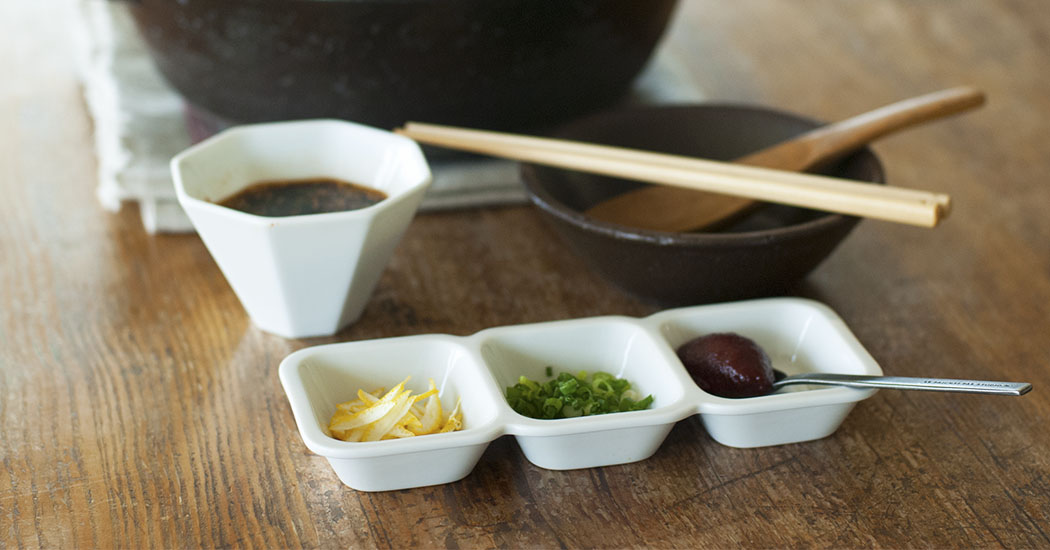 鍋料理を食べる時に欲しい薬味やタレは、それぞれ一皿ずつ盛り付けると