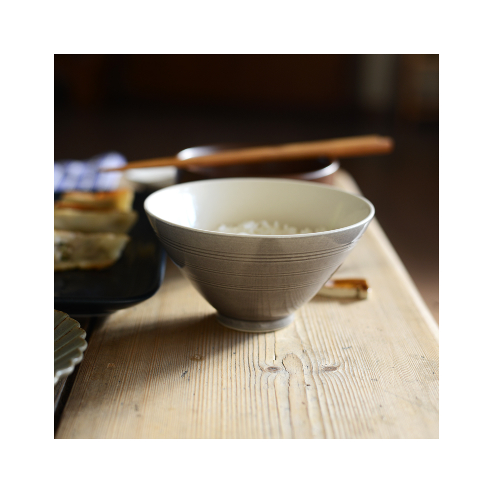 いつもの食卓に自然と調和するような、優しく寄り添う飯碗。薄手に作られた素地とすっと立ち上がったフォルムが軽やかで日常使いの定番に。淡く柔らかい風合いの3色展開。職人が一つひとつ削りを入れた3本ラインがポイント。 ※在庫がなくなり次第、終了となります。