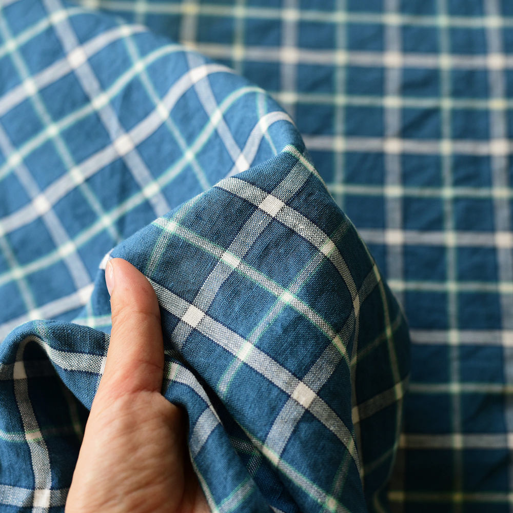 少しスモーキーなブルーベースで可愛らしくなりすぎない、落ち着いた雰囲気のチェック。農家や田舎のキッチンで使い込まれたような、ビンテージ感漂うチェック柄をイメージしました。標準的な生地厚で、キッチンまわりからエプロン、ウエアと汎用性の高い生地です。