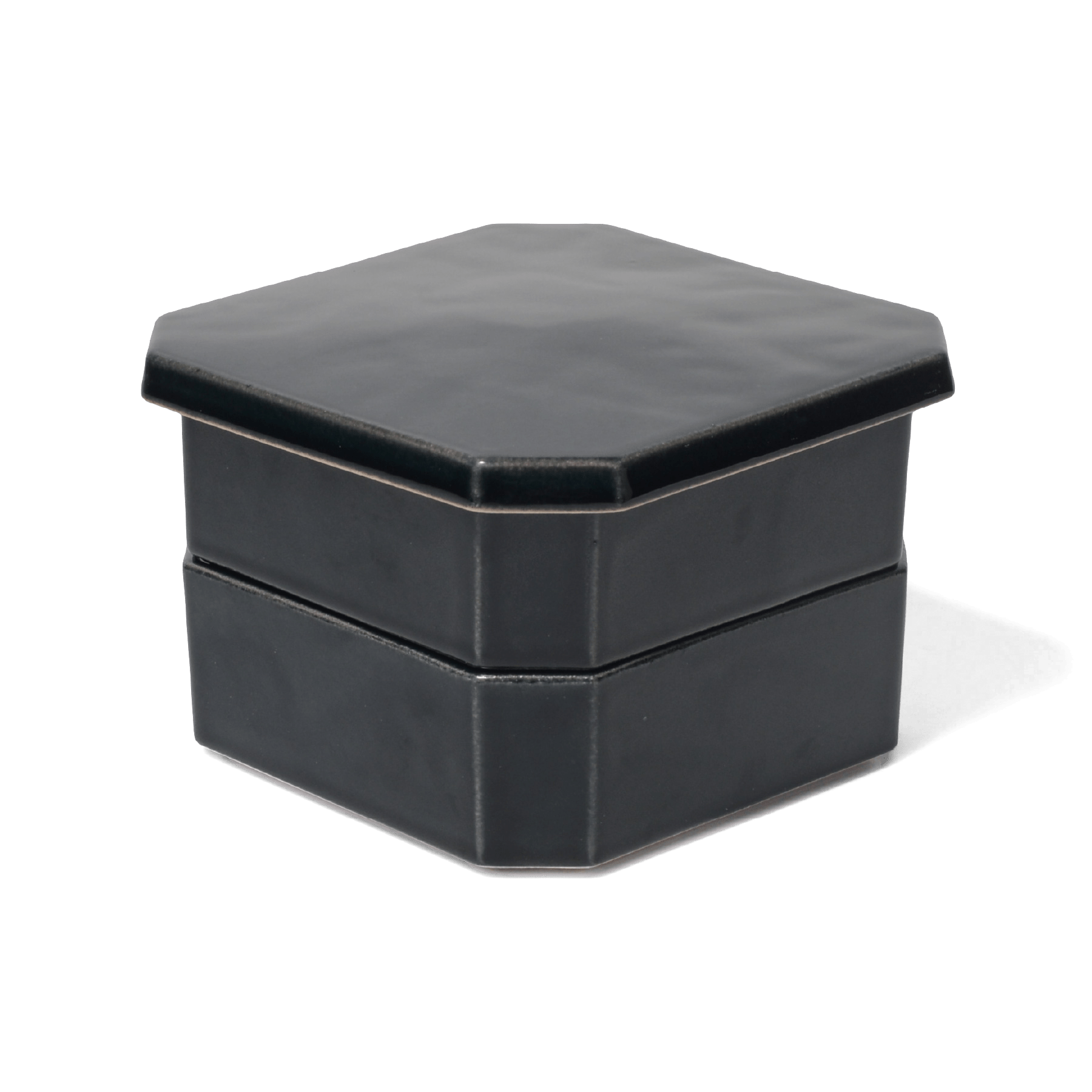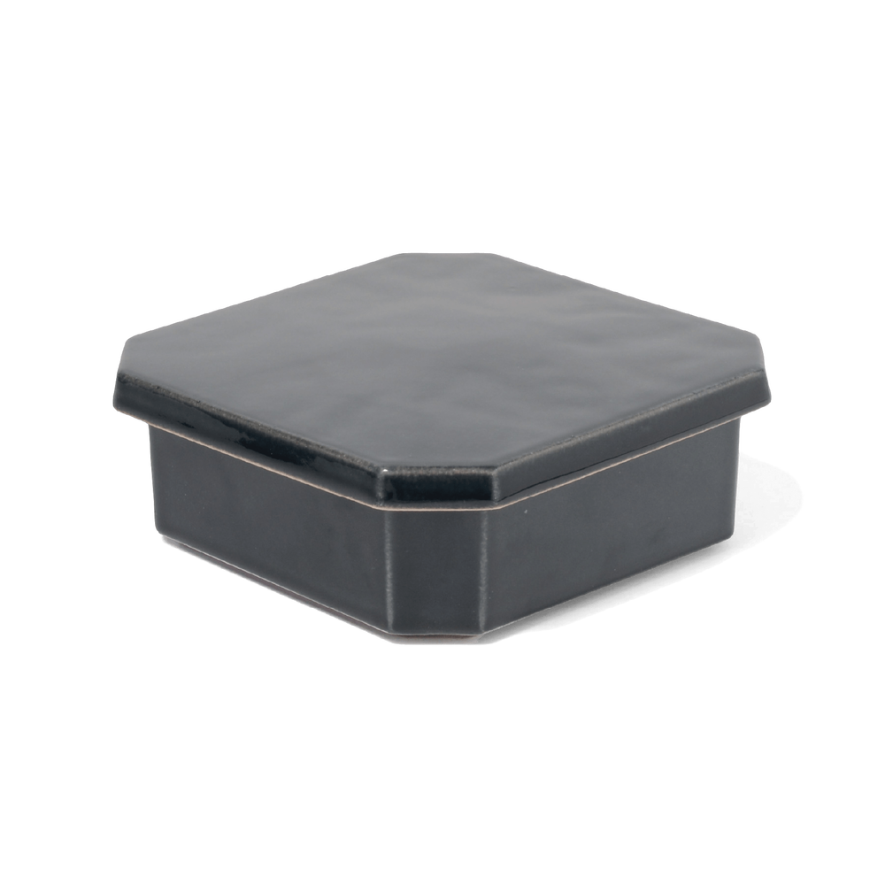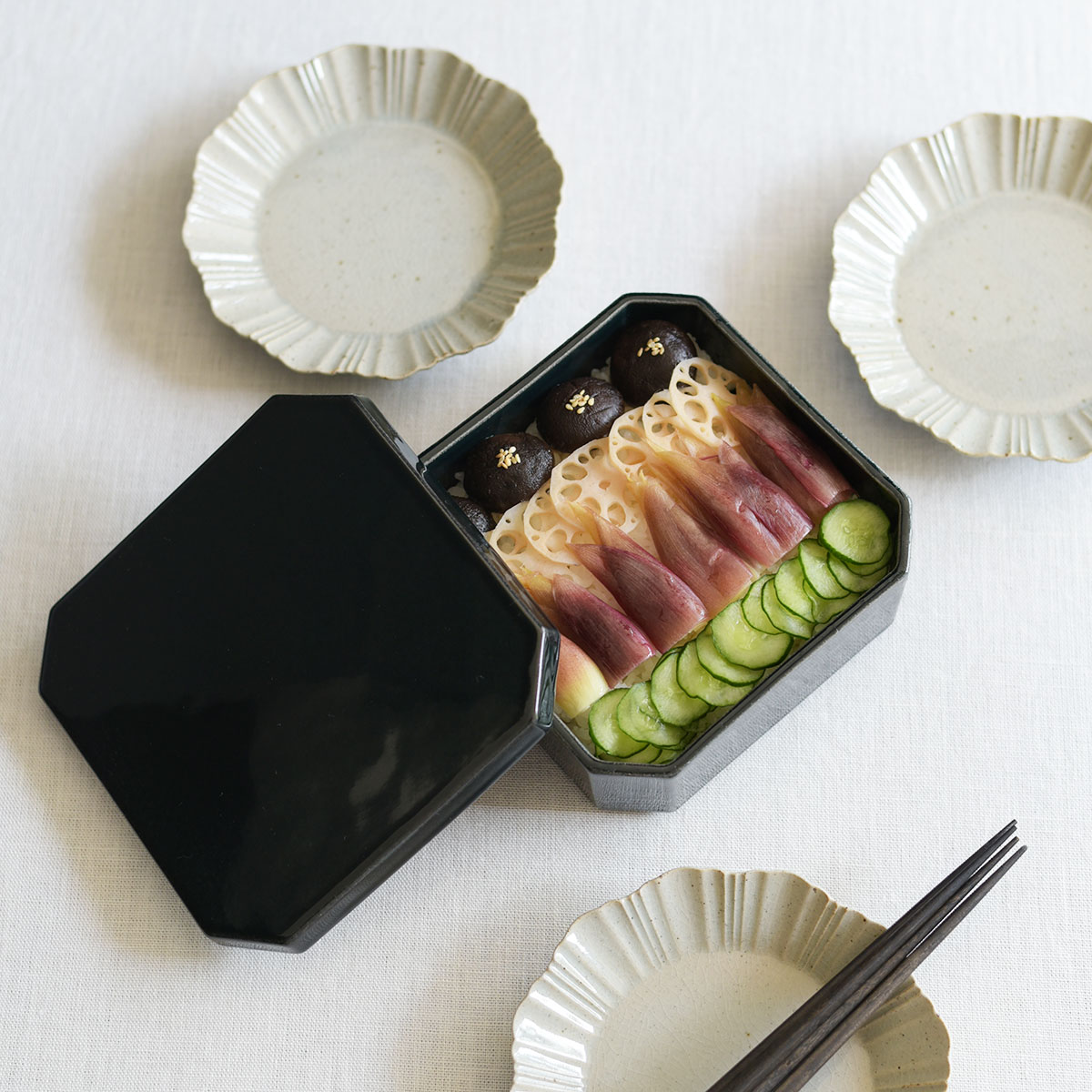 「隅切二段重」は名前の通り、四角形の四隅の角を落とした形の陶製の重箱です。