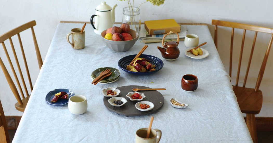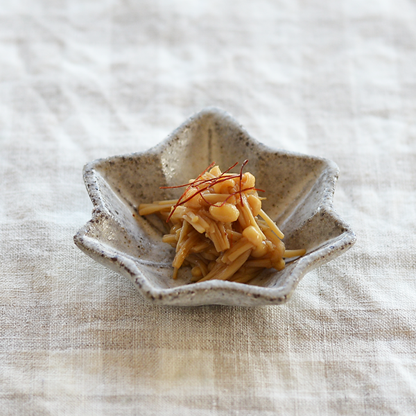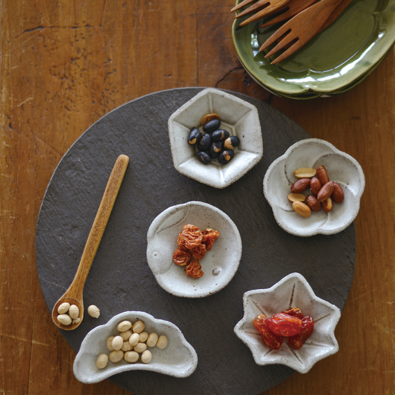 干菓子(ひがし)をイメージして作られた表情豊かな手作りの豆皿。荒土の素材の渋さとモチーフのかわいさのバランスが魅力。職人が一つひとつ丁寧に作っている。漬け物や醤油皿などの食事や、お茶請けのお菓子に使い勝手が良い。種類で集めて気分で選びたい。