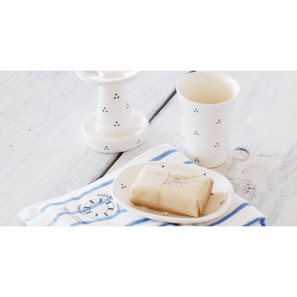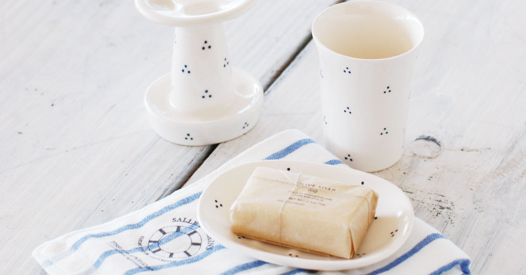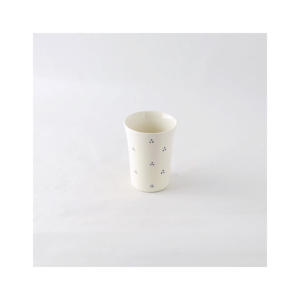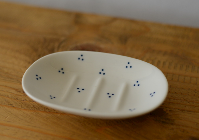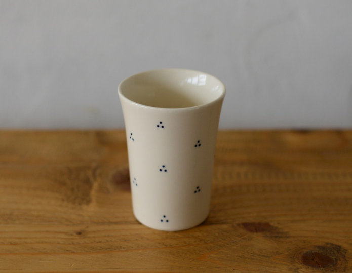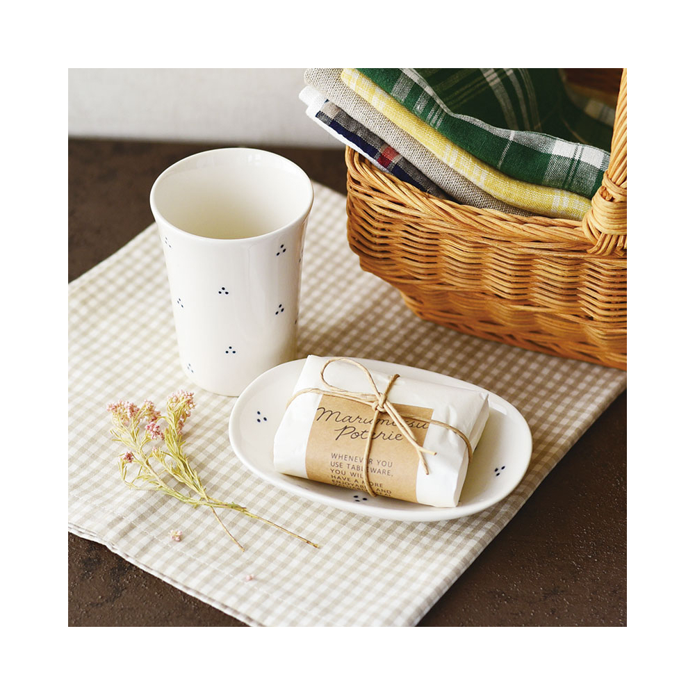 銅板絵付けという技法で施される3つのドットが小花のようにリズムよく描かれていて、