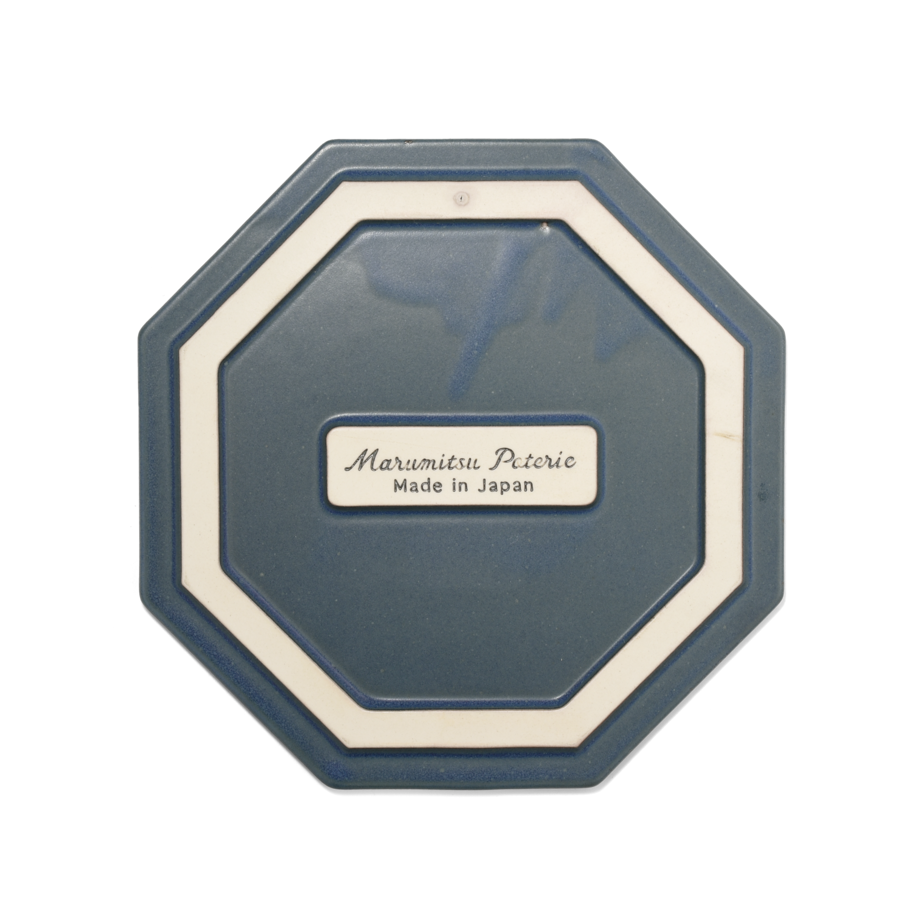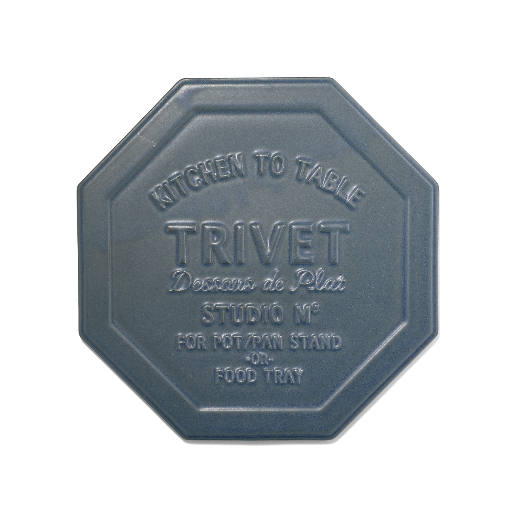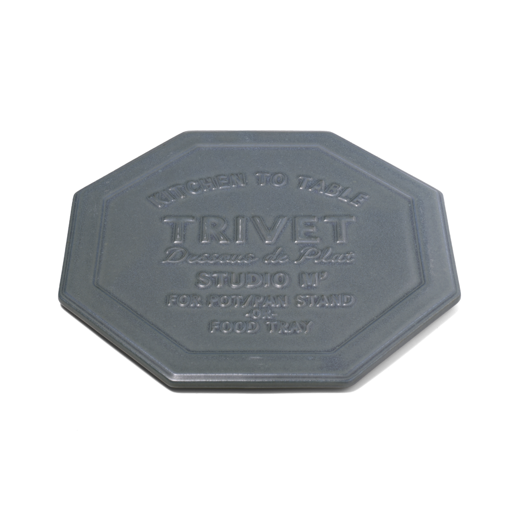 深みのある色合いが魅力的な陶製の鍋敷き。おもて面全体に入ったロゴは、原型を作る職人がすべて手彫りしたもの。凸になった文字の高さも揃っており、見た目も使用感もバランスのとれた仕上がりになっています。