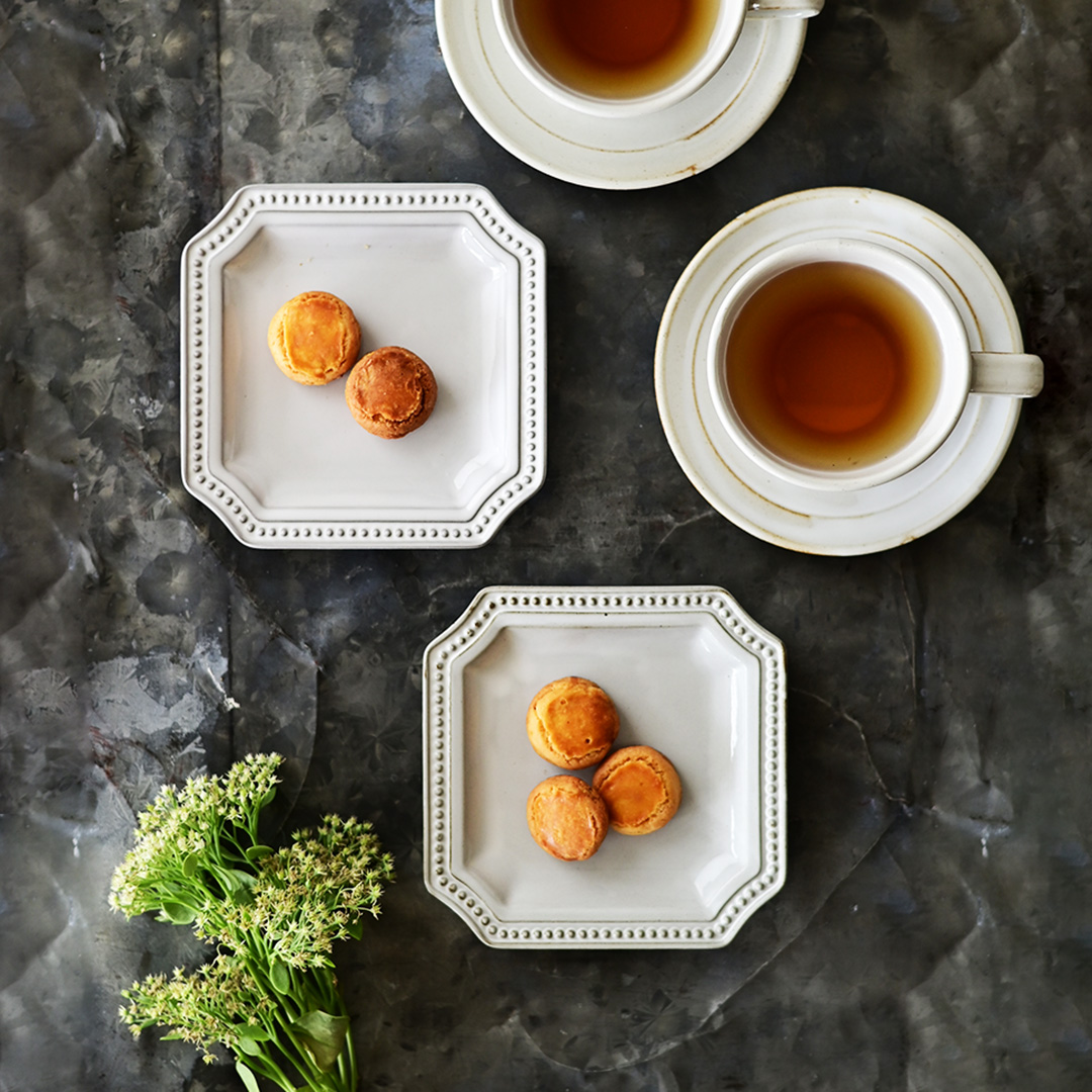 縁のドットが可愛らしくも四隅のくぼみが上品さを漂わせるヴェルナーレ。印象的でありながら盛り面がしっかりあり実用的です。6”プレートは銘々の取り皿や小さな焼き菓子などのデザート用に適したサイズ。時にはティーカップと小さなお茶請けをのせてソーサーとして使うのもおすすめです。白釉から透けた黒土により、真っ白ではない深みのある色です。1枚ずつ違いのある色味や釉薬の表情もお楽しみください。