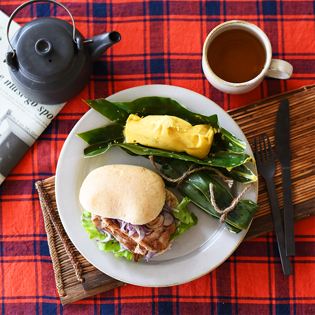 自然豊かなペルーをイメージして、土の素材感の強い食器を中心に選びました。ぽってりとしたシルエットもナチュラルな印象を与えてくれます。南米の陽気な国民性も、オランジュブルーのクロスを使用することで忘れずに表現しています。