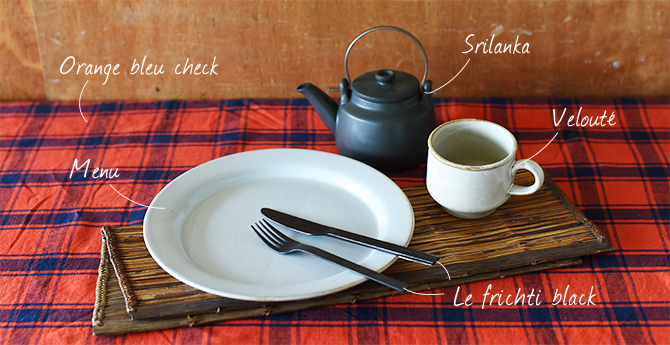 CAST:オランジュブルーチェック/ムニュ ディナープレート 26cm/スリランカ 小/ヴルーテ マグ/フリシティブラック フォークL/フリシティブラック ナイフ
