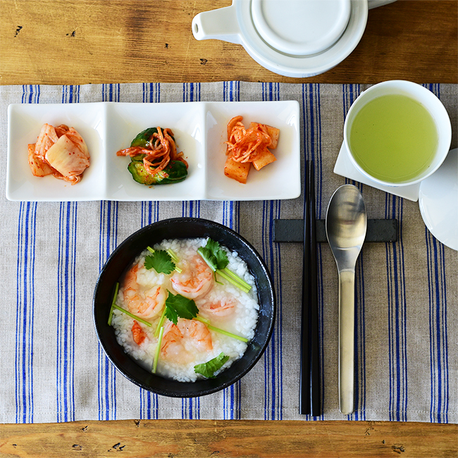 色鮮やかな食材の多い韓国では、白磁の食器がよく使われます。今回も白い磁器を中心に組み合わせてみました。「チュッ」を盛り付けるボウルだけは黒にすることで、おかゆの色を際立たせています。また、格式高い食事の席では、揃いの食器を使うことが多い韓国。ランチョンを使えば、食器一式が揃いのセットのように楽しめます。シンプルな朝ごはんもリッチな雰囲気になります。