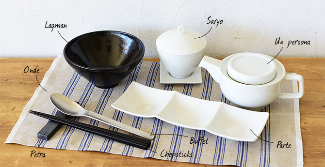 CAST:オンド ランチョンM/ラグマン ボールM/茶寮 煎茶/アンペルソナ ポット/パルテ 3品皿/ペトラ カトラリーレスト/箸 黒檀/ビュフェ スプーンL