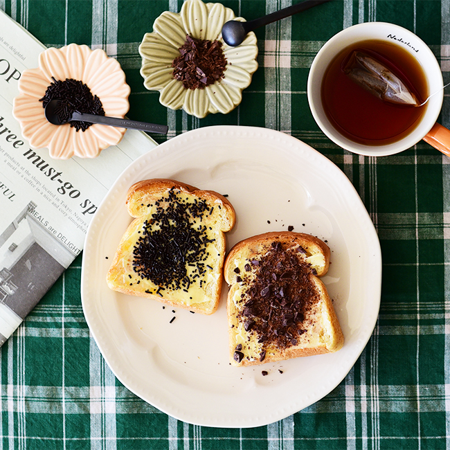 花の産地でもあるオランダをイメージし、花モチーフの器を多く取り入れました。マティネ 9"プレートも一見するとシンプルなプレートですが、盛り面がうっすらとお花の形をしています。豊かな自然を思わせる鮮やかな色合いのテーブルクロスも一緒にコーディネート。また、紅茶用のカップでオランダのナショナルカラーであるオレンジを取り入れました。