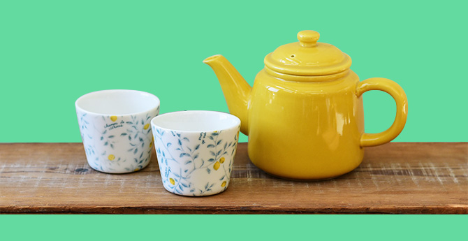 とても栄養価が高い「マテ茶」は飲むサラダとも呼ばれ、野菜が手に入りにくい南米の地域で昔から重宝されてきました。様々な飲み方が発達しましたが、今回はその中でも初心者向きの「マテティー」を楽しみます。茶葉をポットに入れて熱湯を注ぐ、ごく一般的なお茶の淹れ方と同様です。ポットには鮮やかな色合いのレヴェイユ ポットを選び、たっぷりな容量で長くお茶の時間を過ごします。一面のレモン柄が可愛らしいカップはお茶の時間を爽やかに飾ってくれます。