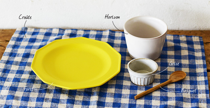 アルゼンチンの人々の陽気な雰囲気や、国旗にも表されている太陽神をイメージして鮮やかな黄色のフォレを選びました。また、自然が豊かな土地をイメージして、カップとプチボウルは土の表情が楽しめる素材感のものを組み合わせます。おおらかなチェックのランチョンマットを敷けば、朝から明るい気分で食事を楽しめそうです。