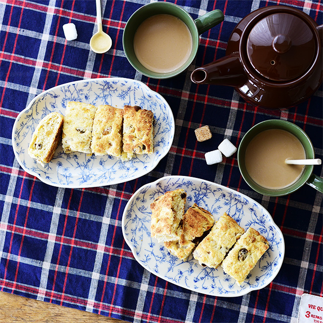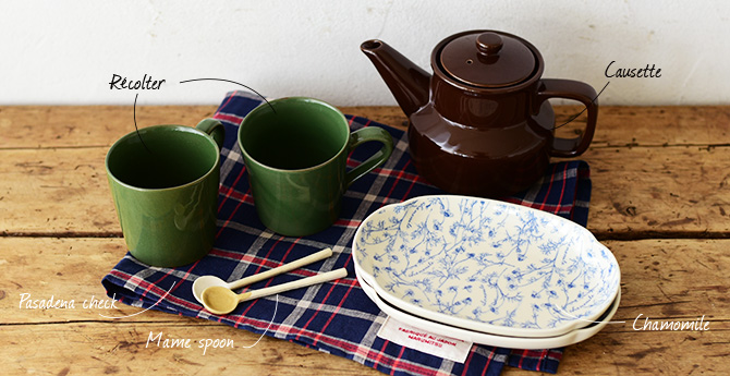 CAST:レコルテ マグ/コゼット ポット/パサデナチェック キッチンクロス/豆スプーン/カモミール 楕円皿