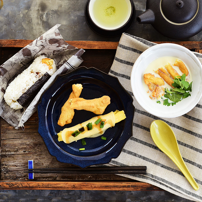 花柄など、上品な器が多い台湾の食器をイメージしたコーディネート。高台のついたメインのプレートはお花の形で食卓のアクセントになってくれます。もち米を使ったファントワンは、直接持つと手にくっついてしまうため、ワックスペーパーで包んでいただきます。シェンドウジャンを入れた鉢もシルエットが美しく、スッキリとした印象に。品数は多いですが、全体的にきれいめな器を集めることで、統一感のある朝ごはんのセットに。