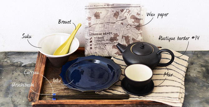 CAST:ブルエ スプーン/スク 4寸天開鉢/ジョリ 6寸皿/カロー 箸置き/漆箸 23cm/ワックスペーパー/ラスティックボーダー#14(黒) クロス500/ミュール ポット/ミュール 煎茶(受皿付)