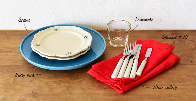CAST:グラン プレートL/アーリーバード ラウンドプレートL/レモネード フラットタンブラー/ホワイトカトラリー フォークL/ホワイトカトラリー ナイフ/ホワイトカトラリー バターナイフ/グロッシェ #40(赤) クロス500×500