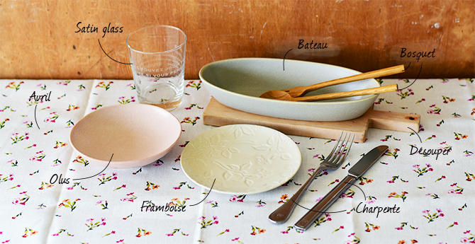 ブルガリア名産の美しいデザインの「トロヤン陶器」をイメージして、全面に装飾が施された「フランボワーズ」を取り皿として選びました。また、自然の恵をたっぷりと受けた季節の食材を楽しむブルガリア。柔らかなマット調の色合いのボウルを2つコーディネートに取り入れ、素朴な味わいを引き立たせます。また、クロスも爽やかで、自然を感じられるものを。可愛らしいお花の模様が、食卓全体を明るく彩ってくれます。