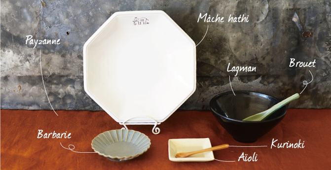 CAST:ペイザンヌ(ブラウン)/マーシュ ハーティ 220クープ(WEB限定)/バルバリ ココガモプレート/アイオリ 角小皿/栗の木 スパイススプーン(L)/ラグマン ボールL/ブルエ スプーン