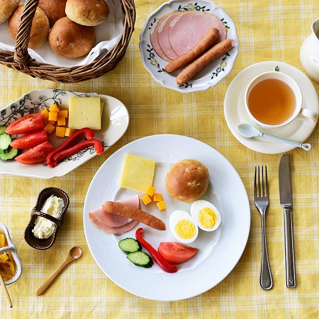 ハンガリーの食器「ヘレンド」の可愛らしい植物模様の器をイメージし、絵付けや模様に特徴のある器を多く選んだコーディネート。たくさんの料理が並び、器の種類が多くなるため、オーバル型や高台の器、さらにはバスケットの形の器なども取り入れ、食卓に変化を出しています。また、黄色のチェックのクロスを敷くことで朝から元気をもらえそうなコーディネートの完成です。