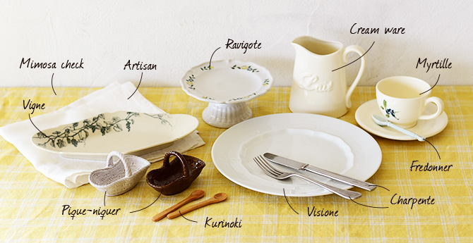 CAST:ミモザチェック/アルチザン(白) クロス500×500/ヴィーニュ プレートL/ピクニケ/栗の木 スパイススプーンL/ラヴィゴット ミニコンポート/ヴィジョネ 10"プレート/シャルパンテ テーブルナイフ/シャルパンテ テーブルフォーク/クリームウエア ミルクピッチャー/ミルティーユ カップ&ソーサー/フルドネ ティースプーン