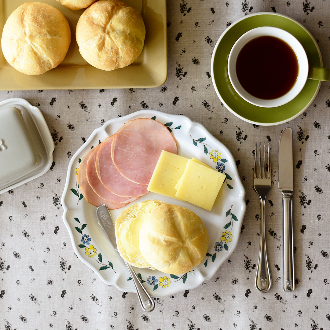 オーストリアの宮廷食器としてもよく見かけられる花柄が描かれた食器。「ラヴィゴット」に描かれた花で、今回は食卓を彩ります。繊細な刺繍を施されたクロスもオーストリアではよく見かけられます。同じく繊細な絵柄の「オールドローズ」を今回はテーブルクロスとして選びました。カトラリーもアンティークのような雰囲気の物を選び、エレガントさを感じられるコーディネートに。