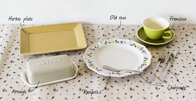 CAST:オールドローズ シングル(グレー)/エルブ プレート/アロンディ バターケース/ラヴィゴット 240プレート/フランシスコ 8ozカップ・レギュラーソーサー/シャルパンテ テーブルナイフ/シャルパンテ テーブルフォーク/シャルパンテ バターナイフ