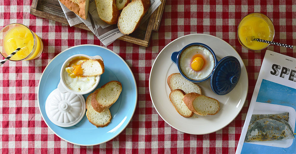海辺の開放的な街をイメージして、ブルーを基調としたコーディネート。木製品もコーディネートに加えると、さらに開放感が増します。また、アメリカらしいポップさも表現するため、はっきりとした色味の器を取り入れています。クロスも素朴でありながらポップな可愛らしさのものをチョイス。赤いクロスでトリコロールカラーのコーディネートの完成です。