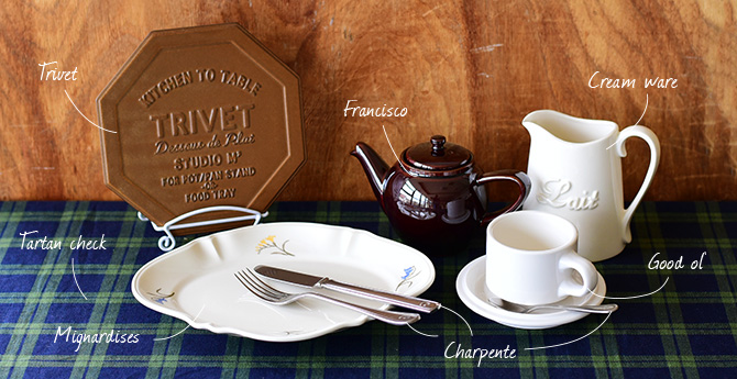 CAST:トリベット/ミニャルディーズ プレートL/フランシスコ ポット/クリームウエア ミルクピッチャー/グッドオル カップ/グッドオル ソーサー/シャルパンテ テーブルナイフ/シャルパンテ テーブルフォーク/シャルパンテ コーヒースプーン/タータンチェック(紺×グリーン)