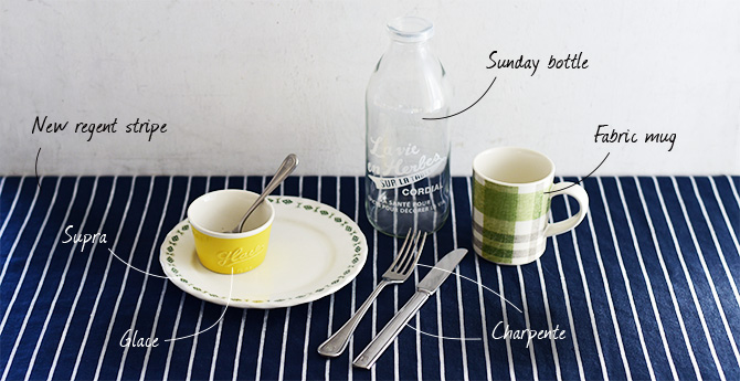 CAST:ニューリージェントストライプ テーブルクロス/スプラ パンプレート/グラース カップ/サンデーボトル/ファブリック マグ/シャルパンテ テーブルナイフ/シャルパンテ テーブルフォーク/シャルパンテ コーヒースプーン